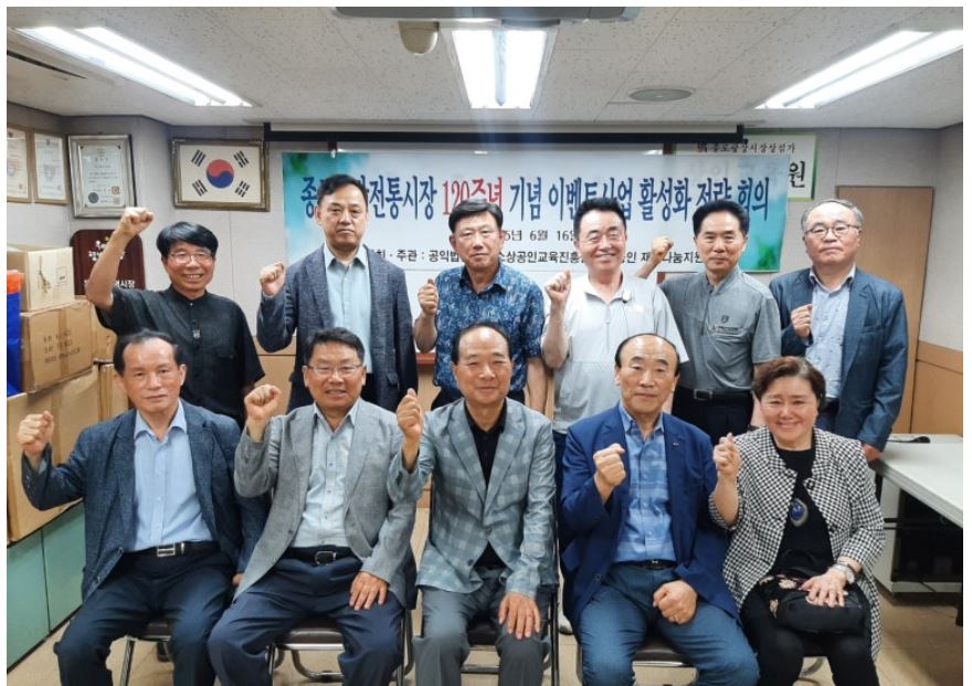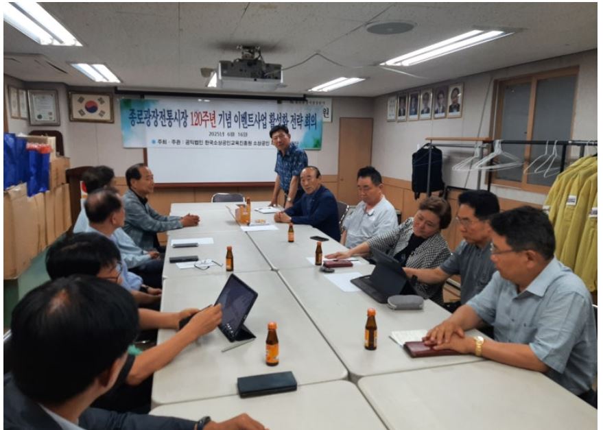 개설 120주년을 맞아 종로광장전통시장의 활성화 전략회의가 개최되었습니다. 지난 6월 16일 광장시장상인총연합회 회의실에서 개최된 본 회의에는 주요 상인들과 함께 '한국소상공인교육진흥원 소상공인 재능나눔지원단' 곽의택 단장 외 전문위원들이 함께 참석해 머리를 맞대고 많은 의견들을 공유했습니다.